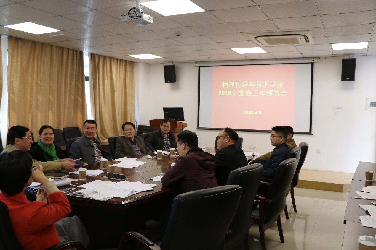 2018年3月9日下午,物理科学与技术学院党委在物理航空大楼438室召开党委扩大会议,部署新学期党建重点工作并开展支部书记代表述职。本次会议由党委书记林奋强主持,学院党委委员、全体教工支部书记、院团委书记、副书记、辅导员、学生支部书记参加了本次会议。