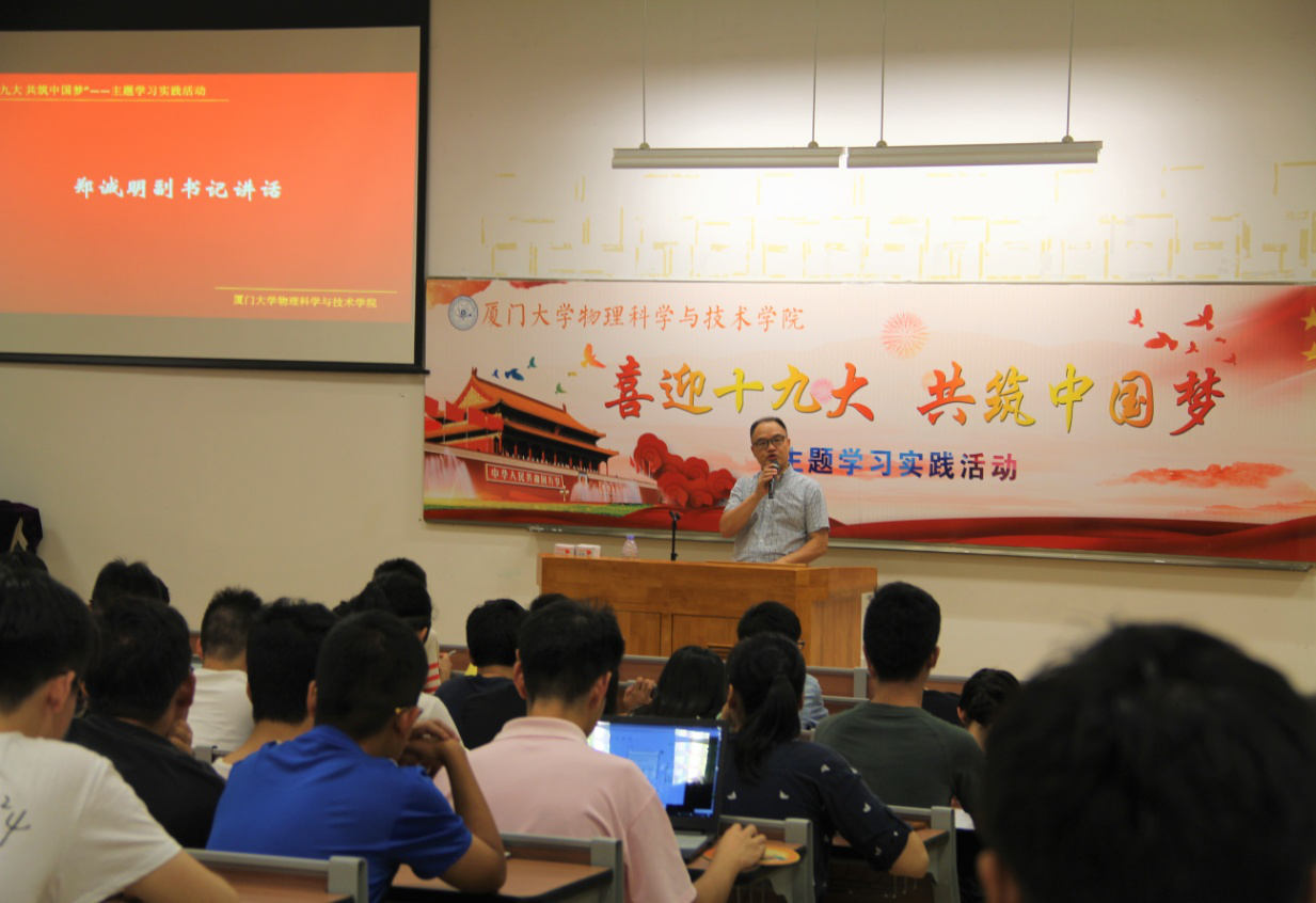 10月13日晚19:00,物理科学与技术学院本科生“喜迎党的十九大,共筑中国梦”主题学习实践活动在物理大楼117报告厅举行。世界杯(中国)党委副书记郑诚明老师、团委副书记陈洪老师、辅导员邱丹文老师以及2015级、2017级全体同学参加了此次学习活动。