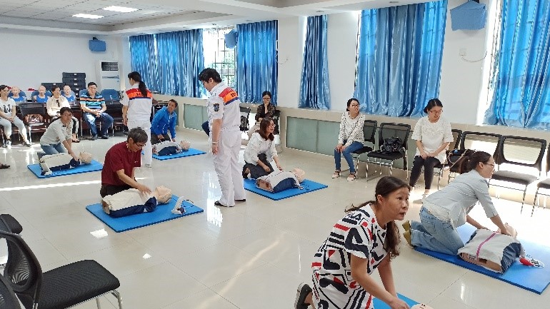 培训开始时,急救中心戚主任首先针对物理实验室的工作性质向大家介绍了电的危害、触电可能引起的后果及应急处理措施。随后,她结合美国心脏协会(AHA)的急救培训视频,详细讲解了“在实际救援中,如何抓住最有效的“黄金四分钟”时间来挽救生命”。老师们在认真听取了戚主任讲解的各个细节和要点后,分成六组进行实操训练。在对急救模拟人进行急救训练的过程中,四位医师手把手纠正老师们的细节错误,通过综合训练确保每位老师的手法,按压吹气时间比例等都学习到位。