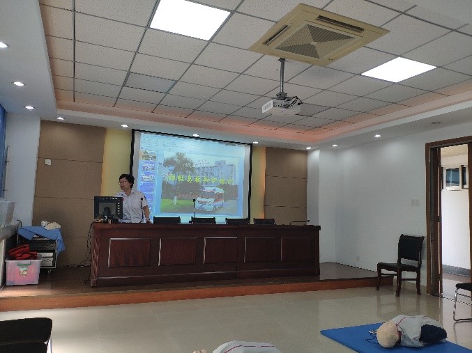 培训开始时,急救中心戚主任首先针对物理实验室的工作性质向大家介绍了电的危害、触电可能引起的后果及应急处理措施。随后,她结合美国心脏协会(AHA)的急救培训视频,详细讲解了“在实际救援中,如何抓住最有效的“黄金四分钟”时间来挽救生命”。老师们在认真听取了戚主任讲解的各个细节和要点后,分成六组进行实操训练。在对急救模拟人进行急救训练的过程中,四位医师手把手纠正老师们的细节错误,通过综合训练确保每位老师的手法,按压吹气时间比例等都学习到位。