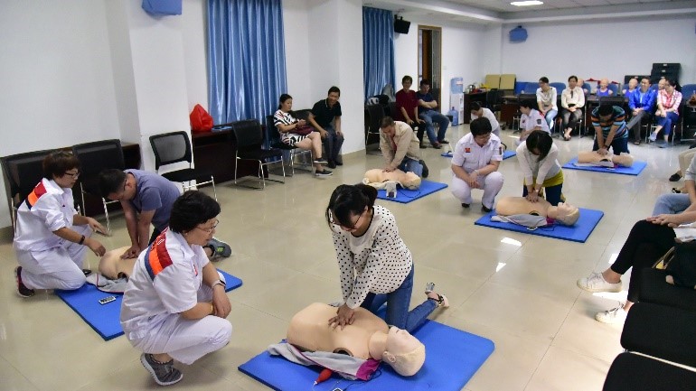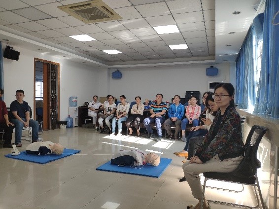 培训开始时,急救中心戚主任首先针对物理实验室的工作性质向大家介绍了电的危害、触电可能引起的后果及应急处理措施。随后,她结合美国心脏协会(AHA)的急救培训视频,详细讲解了“在实际救援中,如何抓住最有效的“黄金四分钟”时间来挽救生命”。老师们在认真听取了戚主任讲解的各个细节和要点后,分成六组进行实操训练。在对急救模拟人进行急救训练的过程中,四位医师手把手纠正老师们的细节错误,通过综合训练确保每位老师的手法,按压吹气时间比例等都学习到位。