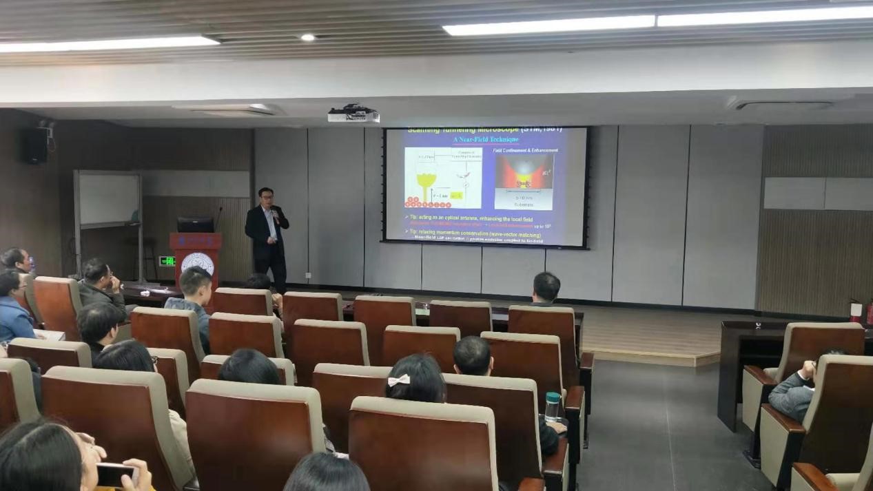 陈张海教授首先简单地介绍了董振超教授的学术经历以及在其研究领域所取得的科研成绩。董振超教授现任职于中国科学技术大学,长期致力于面向未来信息、能源和生物技术的单分子光电效应研究,特别是研制将高空间分辨扫描隧道显微技术(STM)与高灵敏单光子检测光学技术相融合的联用系统,在单分子电致发光、单分子拉曼散射、单分子尺度能量转移、纳米等离激元光子学等方面取得了一系列重要成果。已发表SCI科技论文140余篇,其中作为第一作者或者通信作者,发表Nature两篇、Nature Photonics一篇、Nature Nanotechnology一篇。曾获得全国优秀科技工作者荣誉称号、中国CAIA科学技术奖特等奖、中国科技大学杰出研究校长奖、中科院杰出科技成就奖(主要完成者)、国务院政府特殊津贴证书中国真空学会中国真空科技成就奖。亚纳米分辨的单分子拉曼成像工作入选2013年度“中国科学十大进展”和两院院士评选的“中国十大科技进展新闻”。
