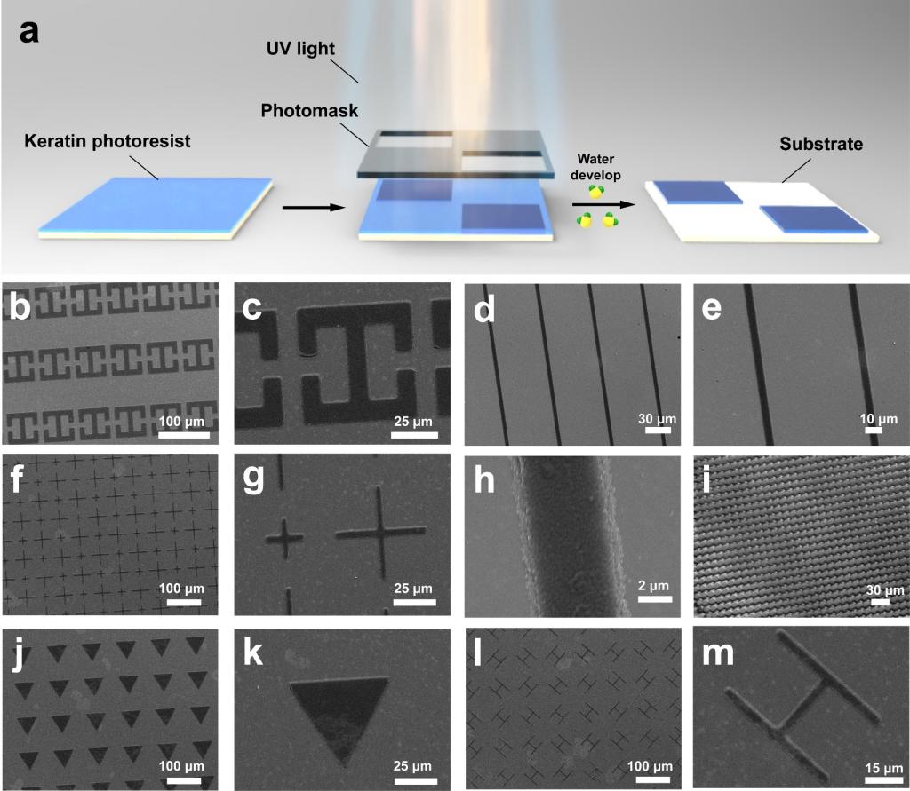2 a) 水基光刻法制备流程图。b-m)不同角蛋白微图案的扫描电子显微镜图像。