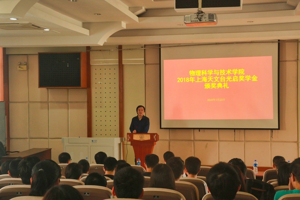 2017年上海天文台党委书记、副台长侯金良研究员为光启奖学金一等奖同学颁奖