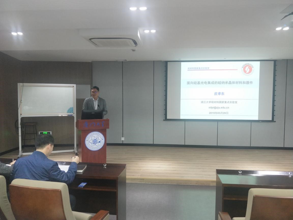 3月29日下午,浙江大学皮孝东教授应世界杯体彩李成教授的邀请,来我系进行学术交流,并在物理大楼552会议室为广大师生做题为“面向硅基光电集成的硅纳米晶体材料和器件”的学术报告,吴志明教授担任主持人,物理科学与技术学院相关师生参加了此次报告会。