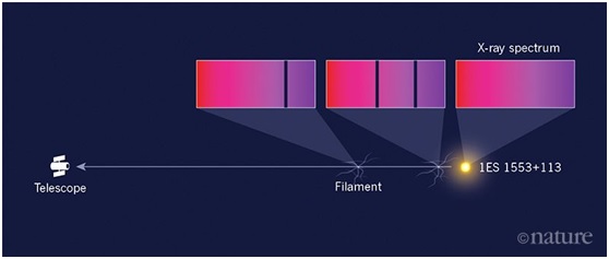 方陶陶教授重点评论了意大利国立天文研究所和美国哈佛-史密斯天体物理中心的Nicastro等人发表在《自然》杂志上最新工作(https://www.nature.com/articles/s41586-018-0204-1)。他们利用XMM-牛顿X射线望远镜观测名为1ES 1553+113的极亮蝎虎天体(BL Lacertae),累计观测时长175万秒(约20天)。这类天体由于位于其中心的超大质量黑洞及其活跃,在一段时间内会变得及其明亮,从而可以作为寻找前景吸收极好的背景源。
