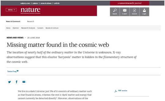 物理科学与技术学院天文学系方陶陶教授应邀在顶级期刊《自然》 (Nature)主刊杂志发表题为《宇宙网状结构中发现失踪重子》 (“Missing matter found in the cosmic web”)的评述文章(https://www.nature.com/articles/d41586-018-05432-2)。在文章中, 方陶陶教授回顾了在寻找失踪宇宙重子方向上的历史,评述了最新进展,并对该方向的今后发展进行了展望。
