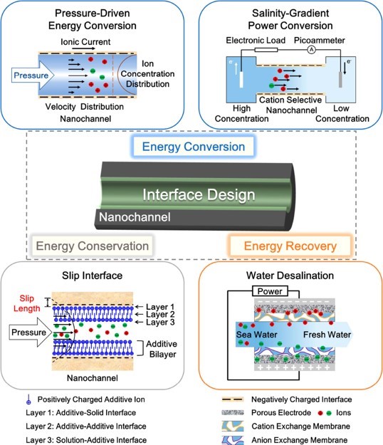 左上:压力驱动液体通过纳米通道,导致双电层中离子流动,产生电流,从而将机械能转换为电能。右上:在浓度梯度下,离子自发从高浓度向低浓度扩散,将吉布斯自由能转换为电能。左下:通过在界面修饰离子型表面活性剂,在内表面构建滑移界面。压力驱动而产生的电流与界面上离子型表面活性剂的移动有关。右下:优化设计的界面能够提高海水脱盐电容去离子化系统能源回收效率。