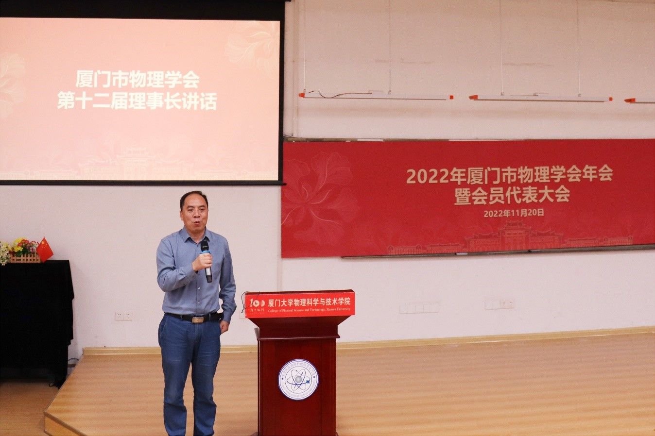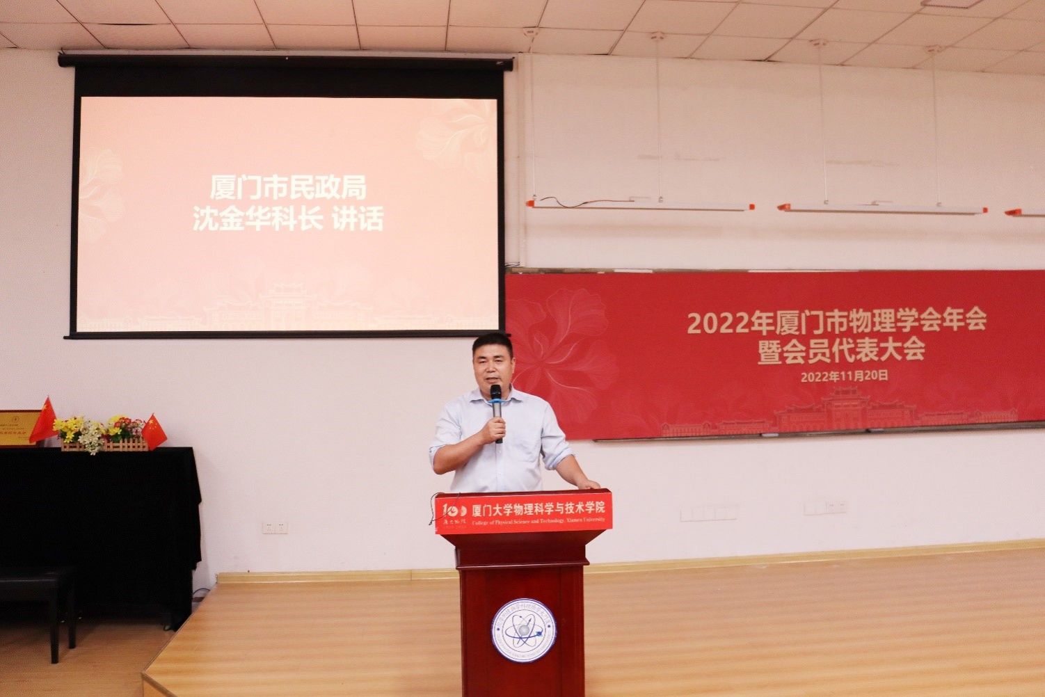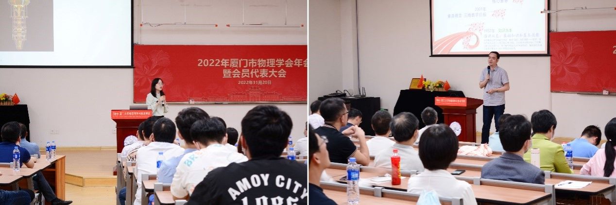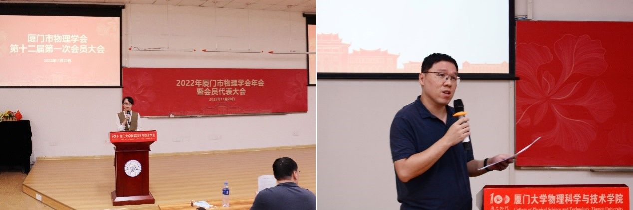 11月20日下午,2022年厦门市物理学会年会暨第十二届会员大会在厦门大学海韵校区物理大楼117报告厅召开。本次活动包括讲座交流,物理学会年度总结报告,理事会及监事会换届选举工作等多项议程。厦门市民政局社会组织管理局沈金华科长,厦门市科学技术协会学会部周莹主任,厦门大学物理科学与技术学院李书平书记,来自厦门市各高等院校、教育科学研究院、各区进修学校、中学等单位的上百名物理教育工作者及科研工作者出席本次大会。