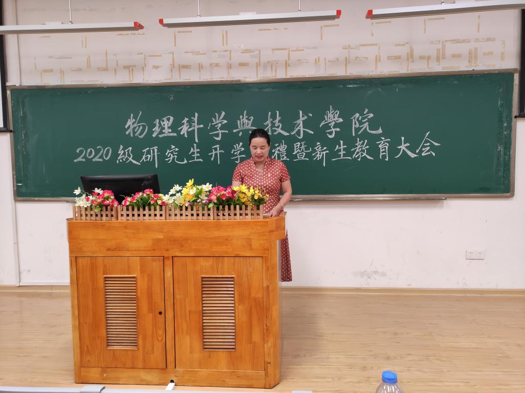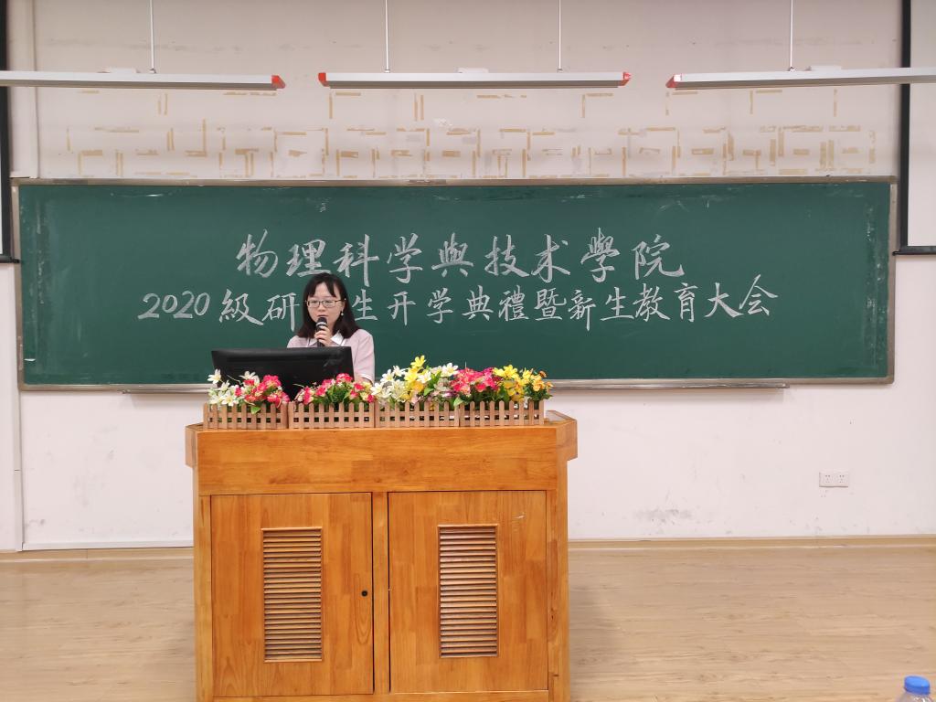 2020年9月12日上午九点,物理科学与技术学院2020级研究生新生开学典礼在物理大楼117会议室召开。学院党委副书记张秀丽老师、学院副院长顾为民老师,物理系主任吴顺情老师、教学秘书方丽老师、研究生辅导员邱丹文老师以及2020级全体硕士、博士新生参加了此次大会。
