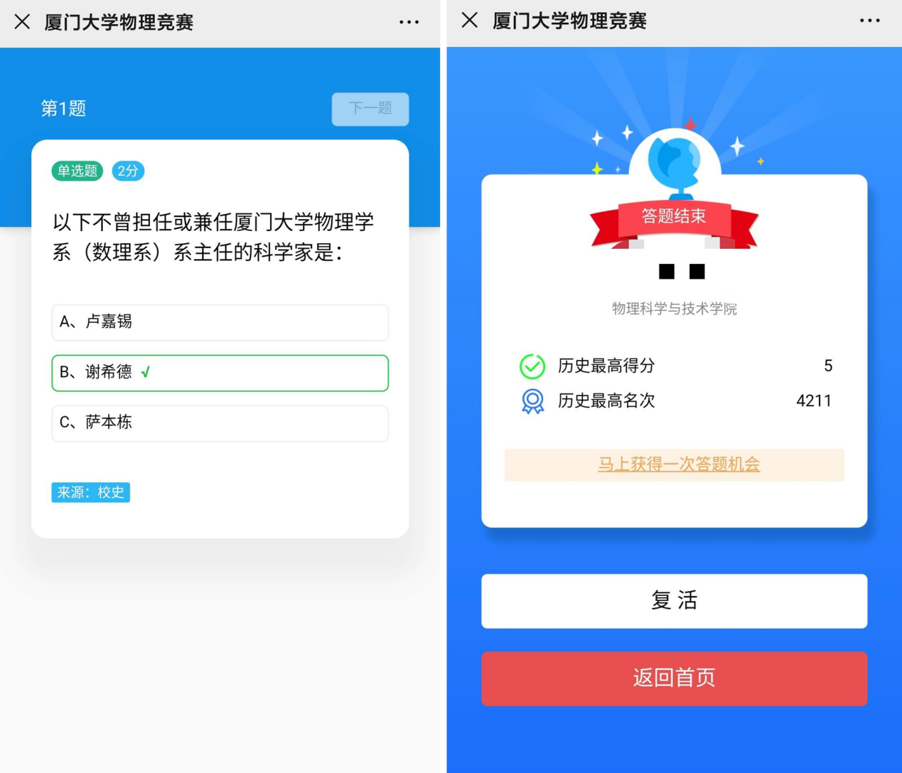 作为传统的物理强校,厦大物理的发展史与厦门大学的校史始终交织。在百年校庆到来之际,以厦门大学的物理学史为切入点,在学业竞赛中渗透“课堂思政”教学理念,也是本届竞赛平台提供的又一个的尝试点。通过题目,在赛中学,同学更加了解了厦大的历史底蕴,为庆祝校庆做了铺垫。参赛同学对这一形式非常欢迎,一位同学这样说到:我曾经去过厦大在长汀的校园,那里现在已经成了厦门大学校史馆的一部分,里面还收藏着一些厦大教师当时自编的《大学物理》《大学物理实验》等书籍。厦大物理系历史悠久,建系以来有谢希德、上官世盘等杰出校友从数理系毕业,物理系目前还设有“纪念谢希德奖学金”、“78物理系校友奖学金”等勉励现有物理系学子认真学习。此外,还设计了一部分关于世界杯体彩物理创新研究成果的题目,为本科生同学了解学术前沿提供了一个喜闻乐见的媒介。