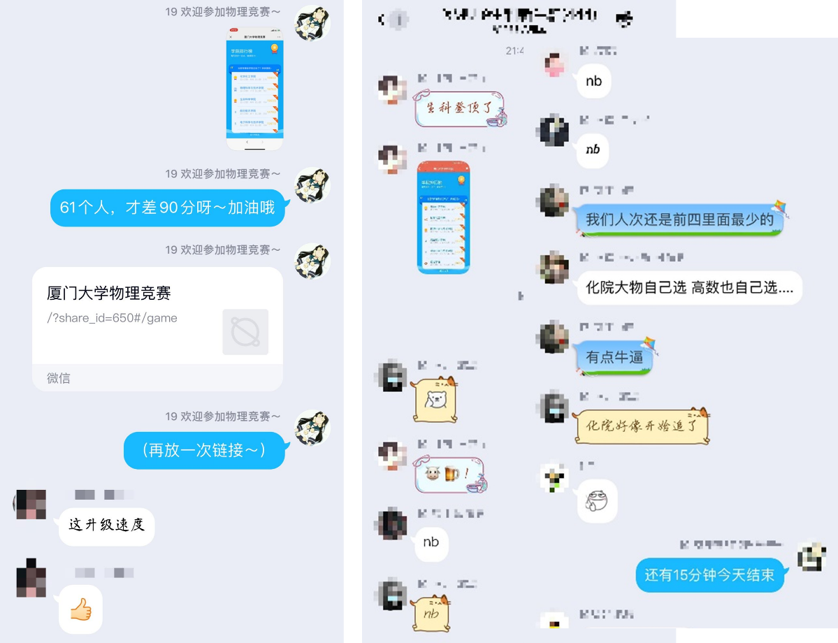 学院参赛热情的背后,总能看到热心人积极的身影。例如生命科学学院,就有这样一位同学,在新生群积极发动同学参赛。学院和她自己能看到努力的效果。尽管身体散落各地如满天星,这样在线上的共同奋战,也让他们大学阶段启航时就感受到了与子同袍的热血。而另一方面,同学已较长时间在家学习,参加这样的学业竞赛也有助于同学舒缓紧张焦虑的情绪。