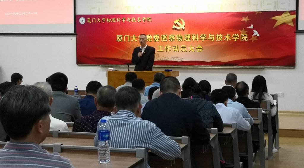 根据厦门大学党委关于开展第二轮巡察工作的相关部署,3月21日,校党委第一巡察组进驻物理科学与技术学院,开展为期一个月左右的巡察工作。21日下午3时,校党委第一巡察组巡察物理科学与技术学院党委工作动员大会在物理大楼117召开。校巡察领导小组成员、校纪委副书记、监察处处长陈雪玲,第一巡察组组长叶鹏飞、副组长宋毅、黄定基,巡察组成员黄艳萍、陈文、王海凤,联络员林志伟、董佳闻等出席了大会。大会由学院党委书记林奋强主持,物理科学与技术学院以及萨本栋微纳米科学技术研究院党政领导班子成员,全体教职工及离退休同志代表参加了动员大会。