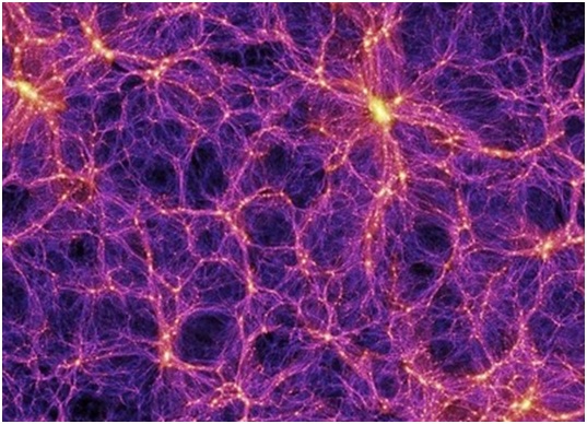 图一 宇宙的蜘蛛网状结构。宇宙的大尺度结构物质分布类似于一张巨大的蜘蛛网,在节点处存在由从成千上万个星系所构成的星系团,而失踪的重子物质则存在于连接这些节点的纤维状结构上。