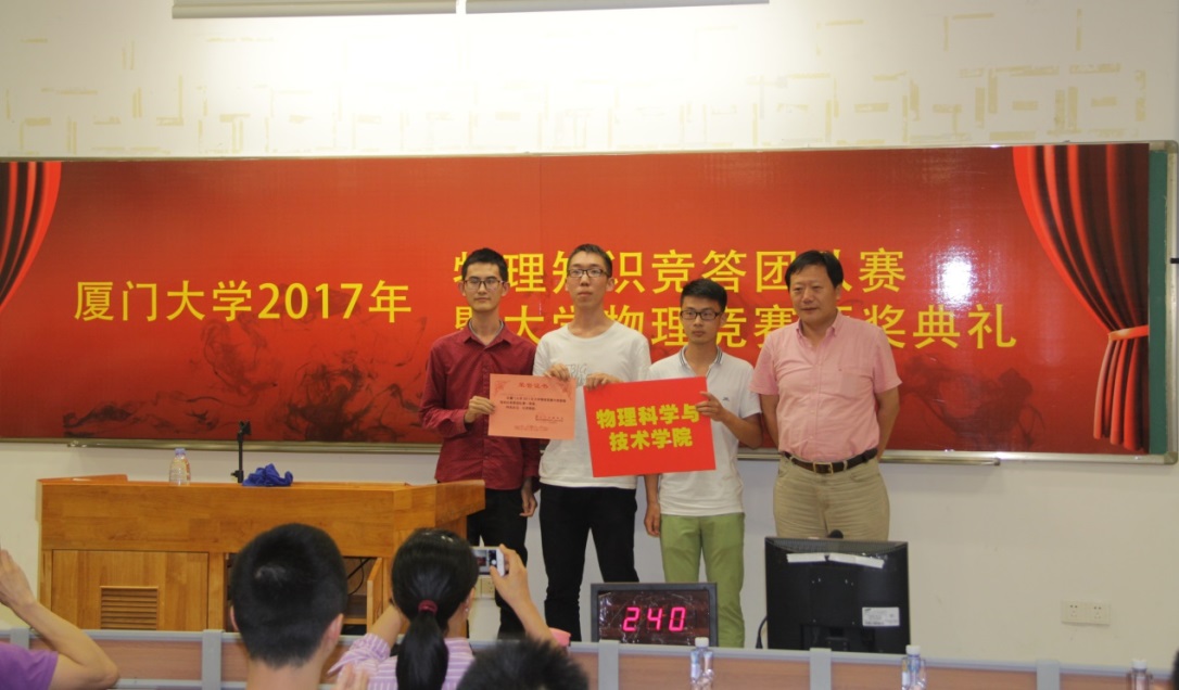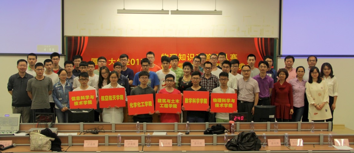 4月26日晚七点,厦门大学2017年大学物理知识竞答团队赛暨大学物理竞赛颁奖典礼在物理机电大楼117报告厅举行。出席这次竞赛领导老师有:厦门大学现代教育技术与实践训练中心副主任姚斌老师、教务处王景辉老师、物理科学与技术学院党委副书记郑诚明老师、副院长李书平老师、办公室主任刘俊希老师、实验秘书张文生、团委书记邱荣锋老师,团委副书记陈洪老师,物理系副主任吴顺情老师,基础物理教学中心主任任雪畅老师,辅导员邱丹文老师,以及各个学院助威团。