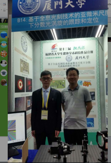 其中由2013级本科生方一奇负责的团队《基于全息光刻技术的亚微米尺度下分数光涡旋的跟踪和定位 》获得福建省特等奖。该项目由物理科学与技术学院陈理想教授指导,结合全息光刻技术,做到了在一个波长450nm左右的亚微米尺度分辨率下对分数光涡旋的跟踪和定位,该技术有望高效地应用于其他构造物质波(如电子束,中子束)的研究,成为一项重要突破。