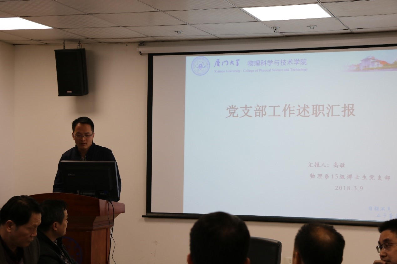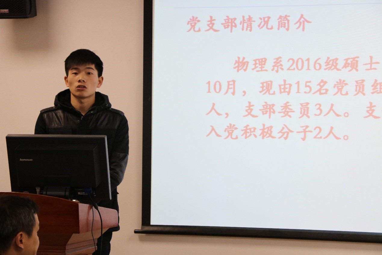 物理系2015级博士生支部书记高敏、物理系2016级硕士生支部书记何冰、物理天文微电子本科生支部书记陆君丹等三位支部书记做现场述职,分别从党支部的活动开展、发展党员情况及支部党员思想政治情况等方面对2017年开展的工作做汇报,在进行总结的同时也深刻反思了各自支部的不足,提出了相应的整改方案。