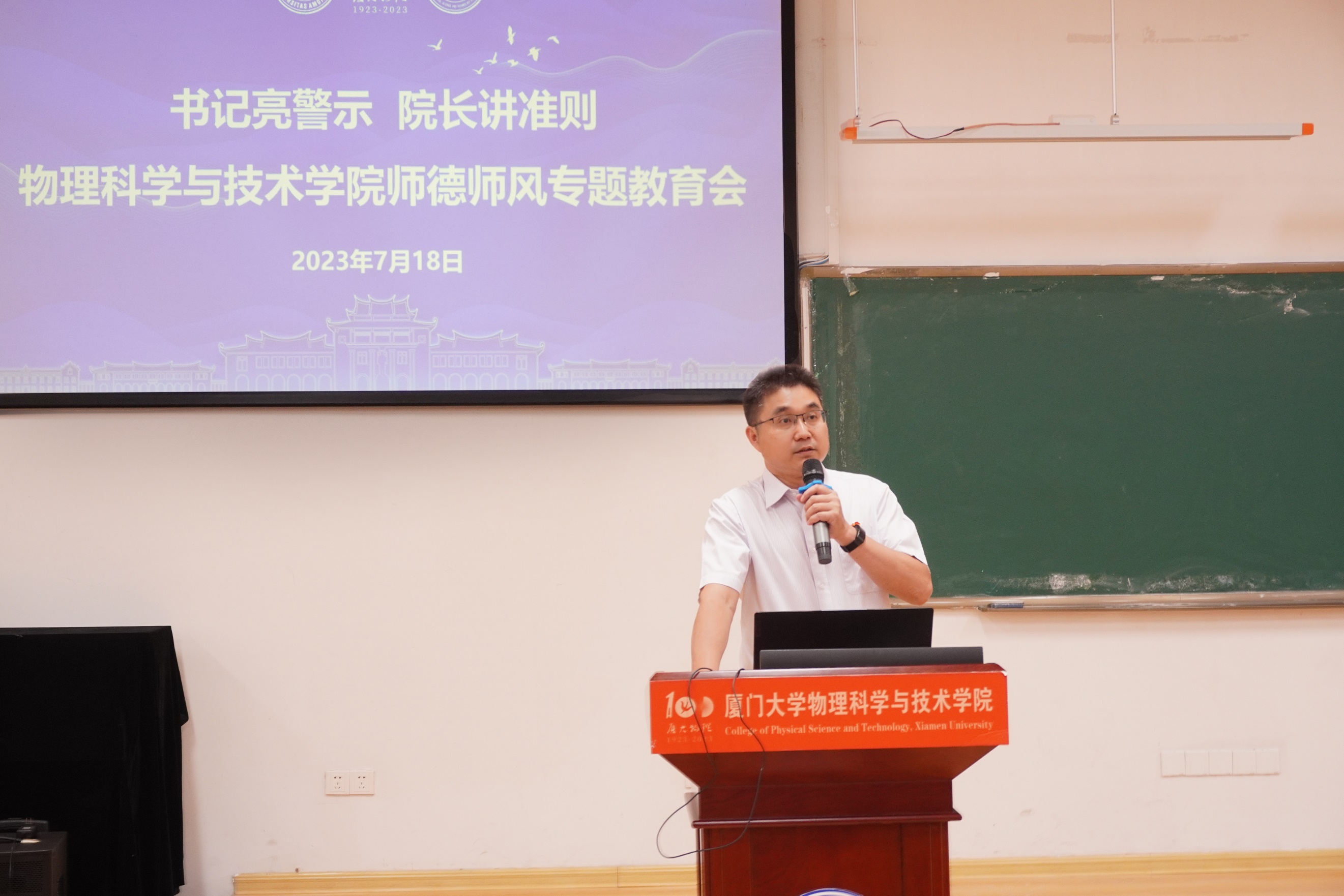 为深入开展学习贯彻习近平新时代中国特色社会主义思想主题教育,进一步加强师德师风建设,物理科学与技术学院于2023年7月18日下午在物理大楼117报告厅召开师德师风教育专题会。学院党委书记李书平主持会议并开展教育。
