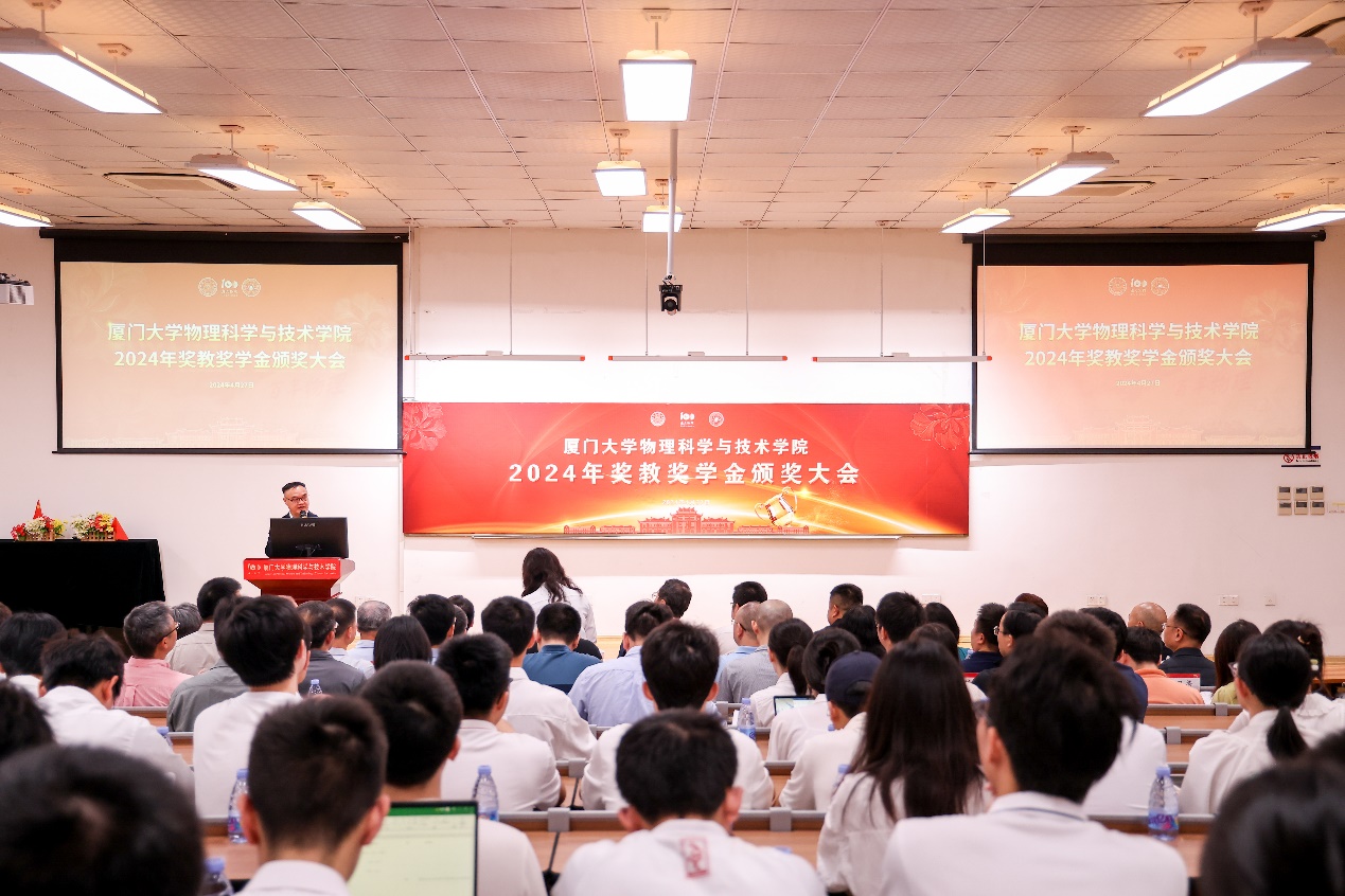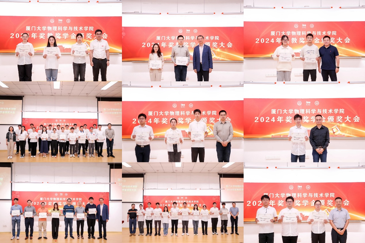 颁奖仪式上,学院为获得院级奖教奖学金的师生制作了贺信与奖状,获奖师生依此上台领奖并合影留念。2024年物理科学与技术学院共设立26项奖教金、奖学金、助学金:谢玉铭奖学金、蔡文种奖学金、86物理学友奖学金、78学友奖学金、78学友半导体物理研究奖、谢希德奖学金、陈智松拔尖人才培养基金、涂庆镇物理科创奖学金、格物致理奖学金、98物理奖学金、傅里叶物理奖学金、三达奖学金、吴伯僖卓越人才培养基金、“01物理杯”厦门大学物理学术竞赛优秀指导教师奖、德智人才基金、上海天文台光启奖学金。