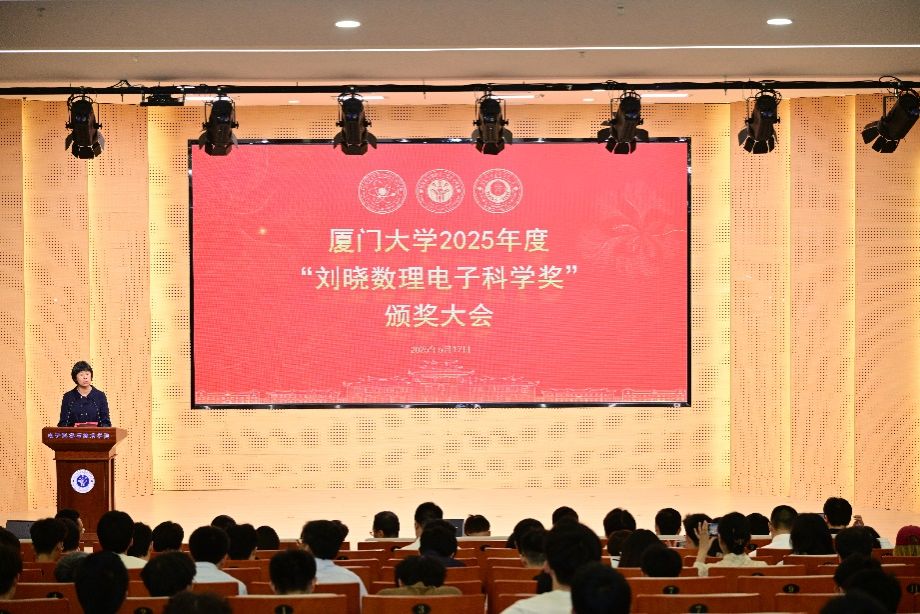 2025年5月17日下午,厦门大学2025年“刘晓数理电子科学奖”颁奖典礼在翔安校区南存钿楼C405报告厅隆重举行。厦门大学校务委员会副主任、关工委常务副主任、校友总会副理事长赖虹凯,四位厦门大学物理系1980级校友——厦门市光电半导体行业协会监事长、教授级高级工程师秦碧芳女士,厦门星光闽电子技术有限公司总经理、高级工程师邱少敏先生,福州惠光照明设计工程有限公司董事长庄惠明先生,厦门大学实验室与设备管理处原处长、电子科学与技术学院教授施芝元,以及厦门大学教育发展基金会副秘书长林智雄,厦门大学校友总会办公室主任陈瑶华等出席本次颁奖典礼。此外出席本次颁奖典礼的还有物理科学与技术学院党委书记李书平、电子科学与技术学院党委书记石慧霞,物理科学与技术学院党委副书记沈丽秀,电子科学与技术学院党委副书记林蕊、党委副书记韩海雄,数学科学学院党委副书记毛通双,以及三个学院全体获奖师生及学生代表共计200余人。颁奖典礼由沈丽秀主持。