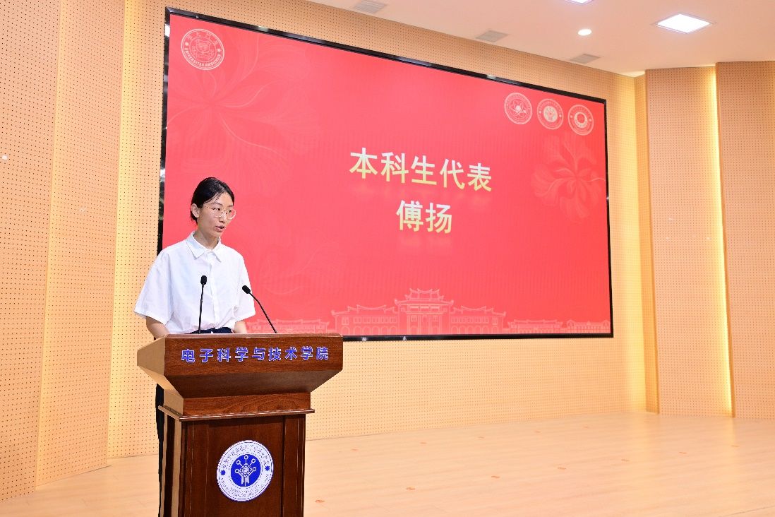 本科生获奖代表、物理科学与技术学院本科生傅扬发言,对刘晓先生的捐资与指导科研的老师表示感谢。她分享了团队参与全国物理实验竞赛的经历,并表示,这份奖学金不仅是物质荣誉的激励,也是继续前行的鞭策,她将继续学好基础学科知识,以科学精神武装头脑,怀家国情怀,成为民族复兴伟业中的有为青年。