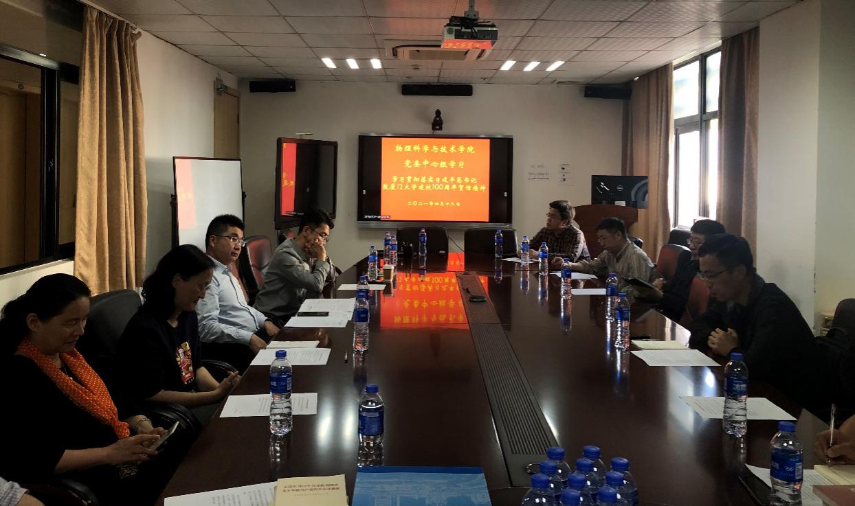 4月12日下午,物理科学与技术学院党委理论学习中心组召开学习(扩大)会议深入学习习近平总书记致厦门大学建校100周年贺信精神。学院党政领导班子成员、党委委员、各支部书记、院办公室主任、团委副书记、辅导员参加此次会议,会议由党委书记李书平主持。
