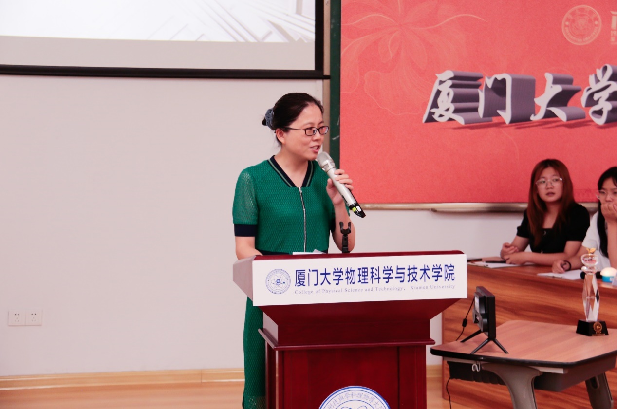 厦门大学教务处黄艳萍副处长上台致辞。她称赞物理竞赛历史悠久,又焕发着勃勃生机,物理科学与技术学院在疫情期间积极应变、主动求变,通过创新竞赛形式保障比赛顺利进行。而赛事参与者人数众多,几乎遍布全校各学院,这让物理竞赛具有更大影响力。竞赛通过将比赛与校史、院史、教育相结合,让其成为课程思政的新阵地;通过将学科与前沿创新比赛题相结合,让同学们感受到了科研的无穷魅力。同时为竞赛研发的手机答题系统更是在学校其他教学内容中发光发热。物理科学与技术学院师生的认真组织,让物理竞赛获得了“2020年品牌赛事”称号,黄艳萍副处长希望学院在“互联网+”的时代背景下再接再厉,深入挖掘、总结竞赛组织规律,并推广到其他学科、学校,传播厦门大学物理学科影响力。
