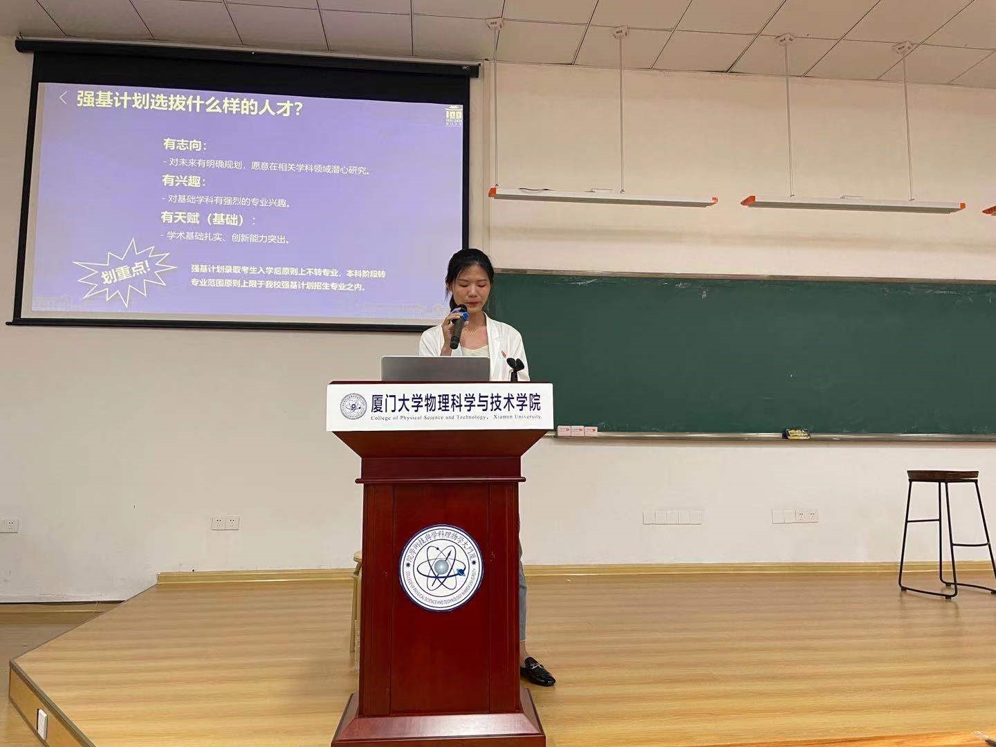 当天下午,全体访学的同学来到了厦门大学海韵园校区物理科学与技术学院学习参观。为了有效对接高考,培养学生的目标意识与规划能力,学院特别邀请厦门大学招生办的吴斯妍老师,为各位直升班学子详细介绍了厦大强基计划招生学科的整体概况,同时也解读了招生政策、选拔要求与推进流程。
