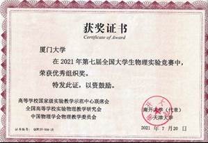 2021年7月18-21日,由高等学校国家级实验教学示范中心联席会、全国高等学校实验物理教学研究会、中国物理学会物理教学委员会主办,南开大学、天津大学和天津市物理学会承办的第七届全国大学生物理实验竞赛(教学赛)在天津成功举办。本届竞赛共有来自北京大学、复旦大学等全国112所高校、400余名学生参加。世界杯(中国)2019级王纪雨、张章勇、徐艺轩和黄楠同学代表世界杯体彩参加了本次比赛,经过激烈角逐,取得了综合类实验一等奖(1项),基础类实验二等奖(2项)的好成绩。同时,世界杯体彩也荣获本次竞赛的优秀组织奖。