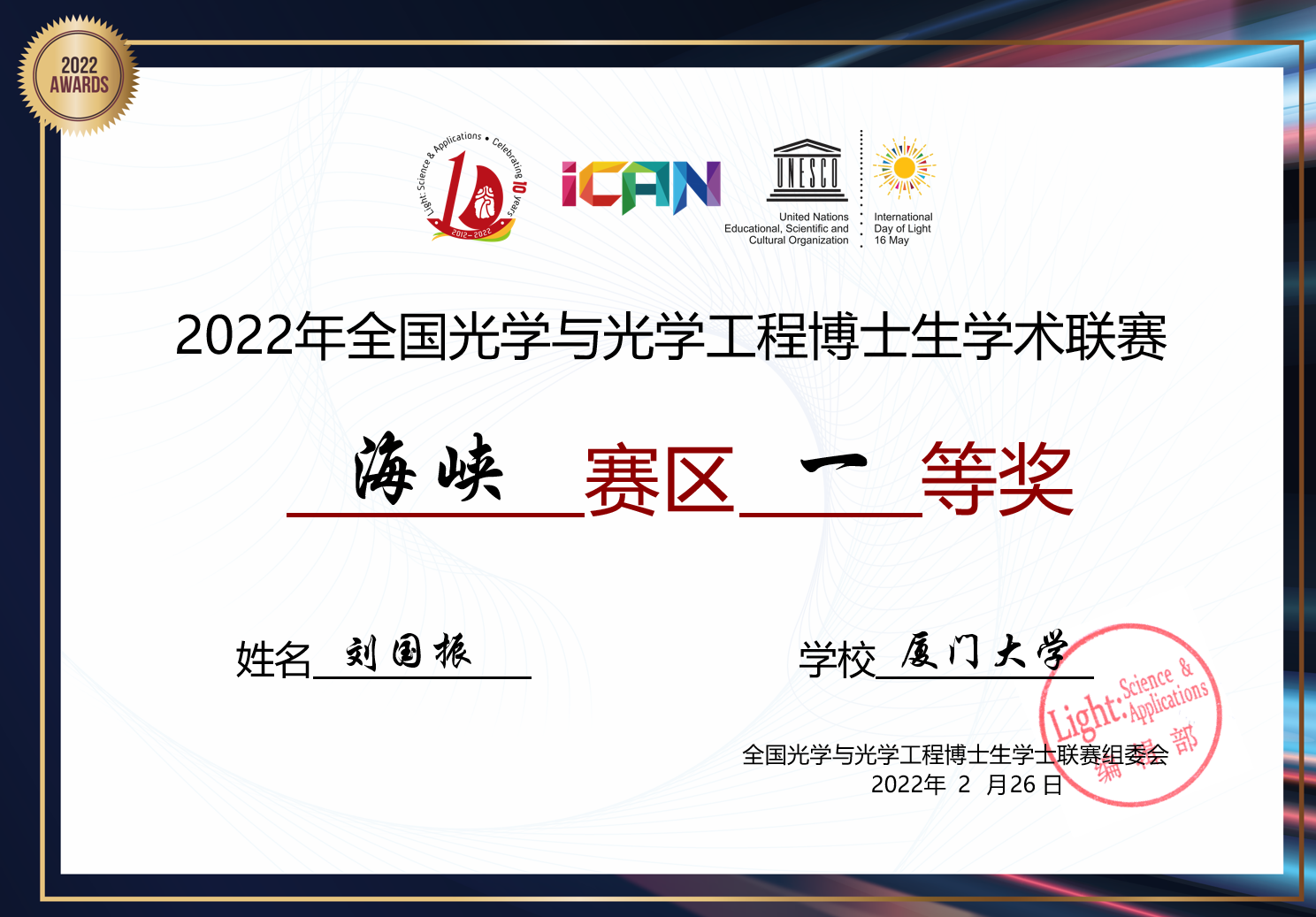 2022年2月26日,全国光学与光学工程博士生学术联赛(海峡赛区)在厦门大学成功举办并圆满落下帷幕。该联赛由国际前沿Light杂志社、iCAN、联合国教科文组织“国际光日”组织委员会所主办,厦门大学承办,物理科学与技术学院资助。