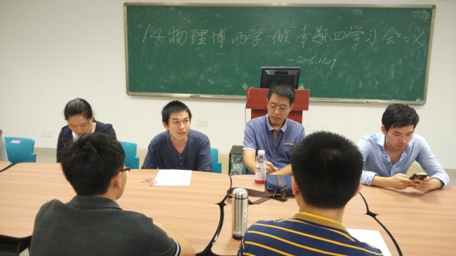 为了贯彻落实党的十八大精神,推动“两学一做”学习教育的深入开展,2016年11月19日中午12时30分,物理系2014级博士生党支部在海韵物理科技学院552教室开展了一场题为“牢记党规党纪,守住为人、做事的基准和底线”的“两学一做”学习教育,活动由党支部书记林伟毅主持。