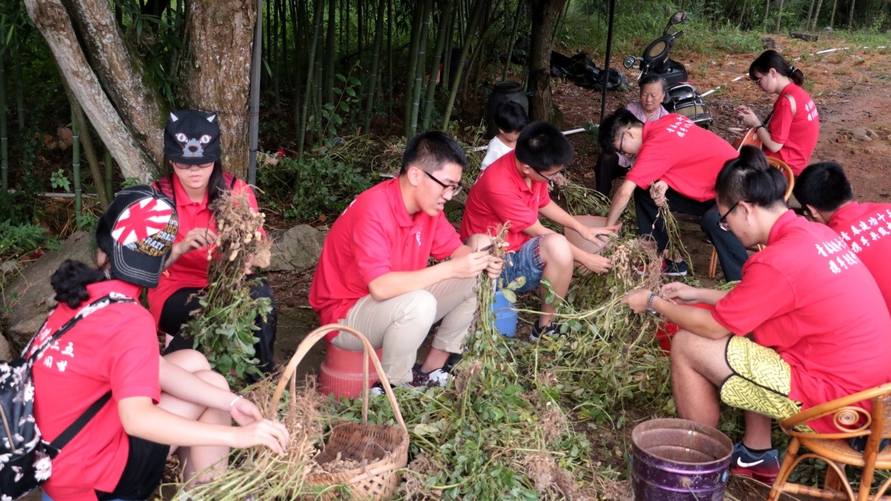 正值当地花生丰收季节,家家户户都开始收割花生,采摘十分辛苦。实践队员们为了帮助当地农户、体验生活,也热火朝天地参与摘花生的劳动中来。从小生长在城镇的队员们之前从未体验过这种劳动,刚开始都无从下手。在老奶奶和阿姨的悉心指导下,大家逐渐掌握了方法,很快便完成了所有任务。尽管在把花生从藤蔓上摘下的过程中需要用很大的力气,队员们也感到手指疼痛不断袭来,但大家没有抱怨一声,咬牙坚持了下来。看着筐里越来越满的花生果实,大家感受了生产劳动的不容易,同时也为自己劳动成果而感到自豪。
