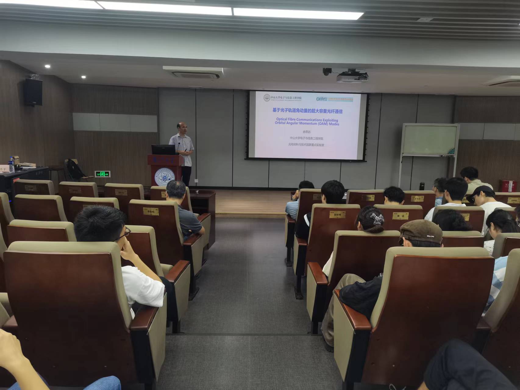 2023年10月27日, 中山大学余思远教授应物理科学与技术学院的邀请,做客物理科学与技术学院 “萨本栋讲坛”第146期,在海韵校区物理楼552报告厅做了题为“基于光子轨道角动量的超大容量光纤通信”的学术报告。报告由物理科学与技术学院副院长陈理想教授主持,相关师生参加了此次报告。