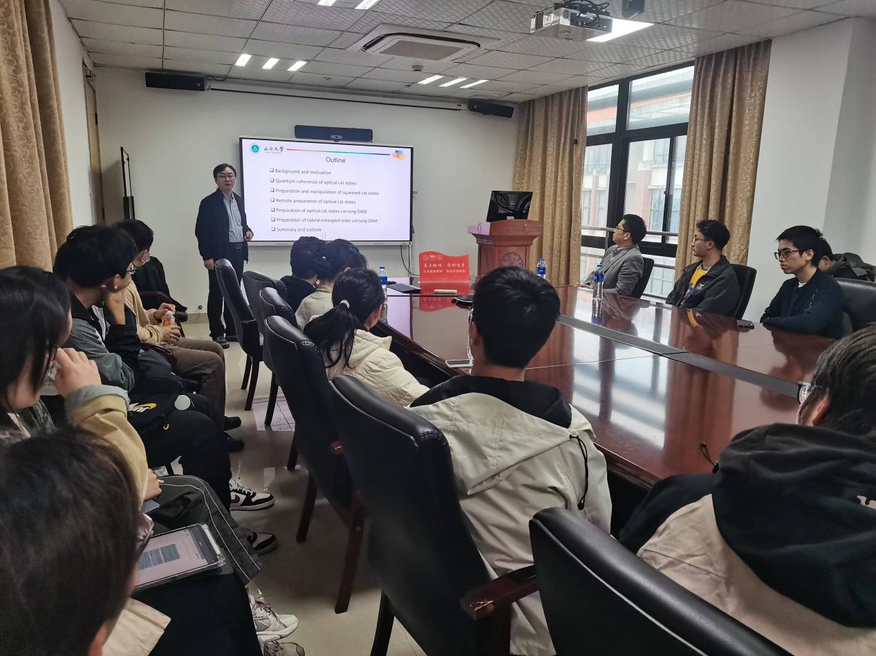 2024年12月25日,山西大学苏晓龙教授应邀在厦门大学海韵园物理大楼407报告厅作了主题为“光学猫态和混合纠缠态的制备与操控”的讲座(萨本栋系列讲坛第189讲)。讲座由厦门大学物理科学与技术学院副院长陈理想教授主持。
