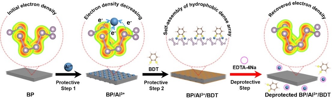 研究团队受化学领域保护基化学策略的启发,通过保护基策略实现对黑磷烯反应活性的有效调节。在保护阶段,采用缺电子的金属离子(Al3+)与黑磷烯表面的磷原子相互作用,降低磷原子的电子云密度,从而降低黑磷烯的反应活性;再通过金属-硫键在黑磷烯表面组装致密的疏水小分子层(苯二硫醇:BDT),进一步隔绝周围环境的氧气和水,达到稳定黑磷烯的目的。保护后的黑磷烯在高湿度环境下稳定存在至少60天之久,且观察到最长的稳定时间可以长达一年,为黑磷烯的实际应用和储存提供了有利的保障。在脱保护阶段,采用具有强配位能力的活性分子与金属离子配位,将黑磷烯表面的金属离子和疏水小分子移除,恢复其反应活性。研究发现,脱保护后的黑磷烯表现出与初始黑磷烯相同的降解行为,表明其反应活性恢复,同时黑磷烯的晶体结构、导电性和光热转化效率并没有受保护-脱保护过程影响。