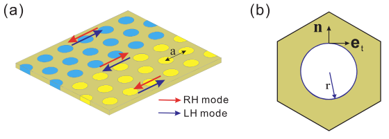 图1. (a). 实现反螺旋边界条件示意图,在薄膜中植入两种金属。(b). 当植入一种金属时的元胞。