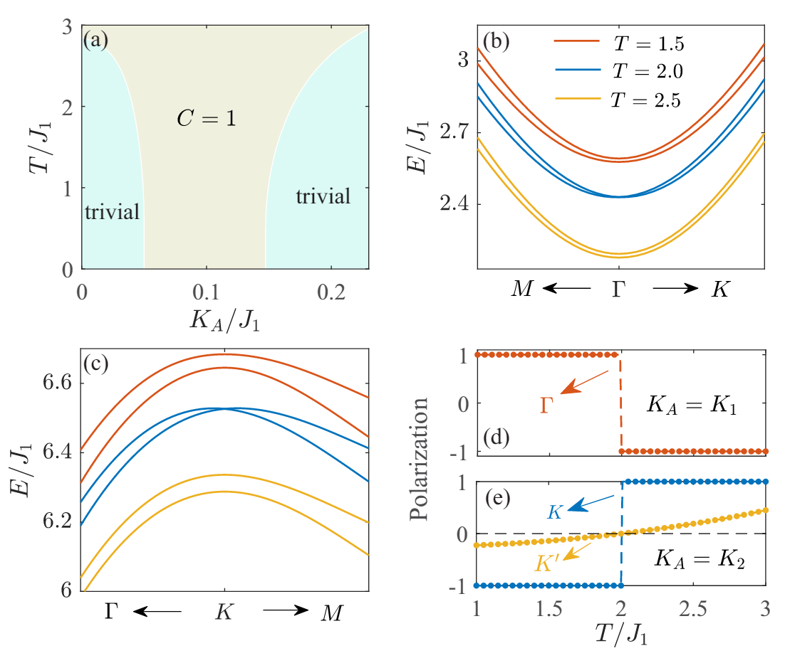 在有限温度下,利用有限温度场论的方法来处理自旋波之间的相互作用,提取对自旋波的温度依赖的自能修正。有限温度下的相图如图10 (a)所示。在零温下拓扑非平庸区间的拓扑相并不会被温度破坏。有趣的是,零温下拓扑平庸的区间当温度升高超过某一临界温度之上时,也将展现出陈数为1的拓扑相。在相图的左边区域,随着温度升高,能带在Γ点的带隙在临界温度关闭,继续升高温度打开带隙,实现拓扑转变,如图10 (b)所示。相图左边的拓扑转变起源于有限温度带来的弱亚铁磁相。因为两支能带占据数不同,由此导致A和B两子格的磁化出现差别,带来自旋波的拓扑转变。在相图右边区域,能带在K点带隙关闭重新打开,如图10 (c)所示。