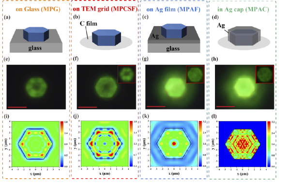 Fig.1 (a-d)结构示意图, 分别将MP定位在玻璃上(a)、碳膜TEM网上(b)、银膜上(c)以及银帽中(d)。(e-h)实验采集到相应上转换发光图。(i-l)数值计算得到的激发电场分布图。
