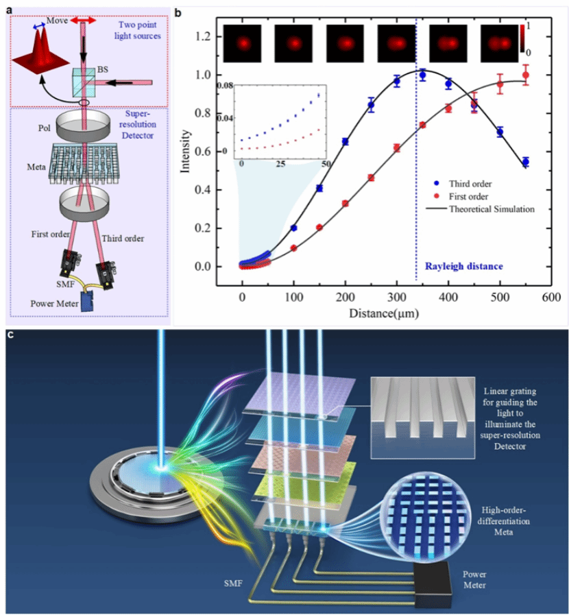 为了进一步展示高阶微分运算的优势,该联合团队还利用高阶微分超表面构建了一个光学超分辨探测器(图3)。基于此,对两个相邻的非相干点光源进行光学微分运算。研究表明,即使在瑞利极限以内,随着两点光源距离的变化,微分后的光强仍会显著变化;同时,随着微分阶数的增高,这种变化会变得更为剧烈。因此,通过检测微分后的光强变化便可反推出两点光源间的距离。实验上采用三阶微分运算,实现了近千分之一瑞利距离的横向分辨。进一步地,他们在理论上证明了该方案也可用于多个未知点光源的超分辨测量,即超分辨成像。由于超构表面与现有半导体微纳加工系统的高度兼容,该方案可用于解决多曝光光刻工艺中光学对准的难题。