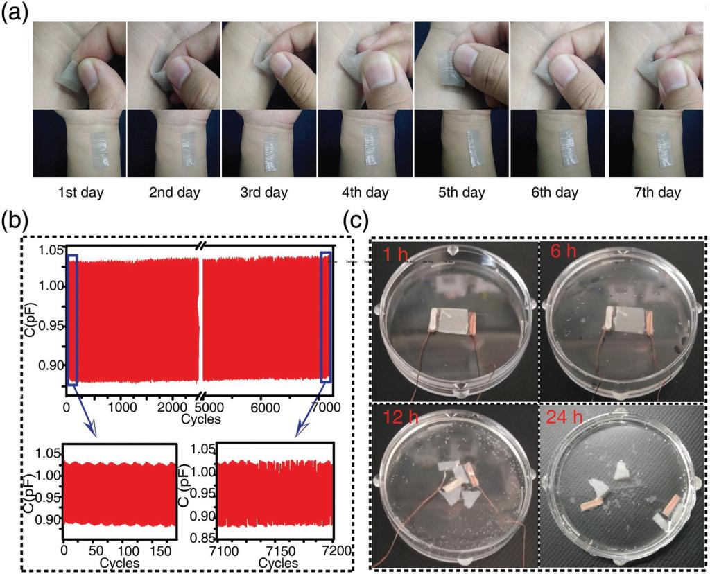 图3 传感器的亲肤透气性、循环稳定性及可降解性的表征
