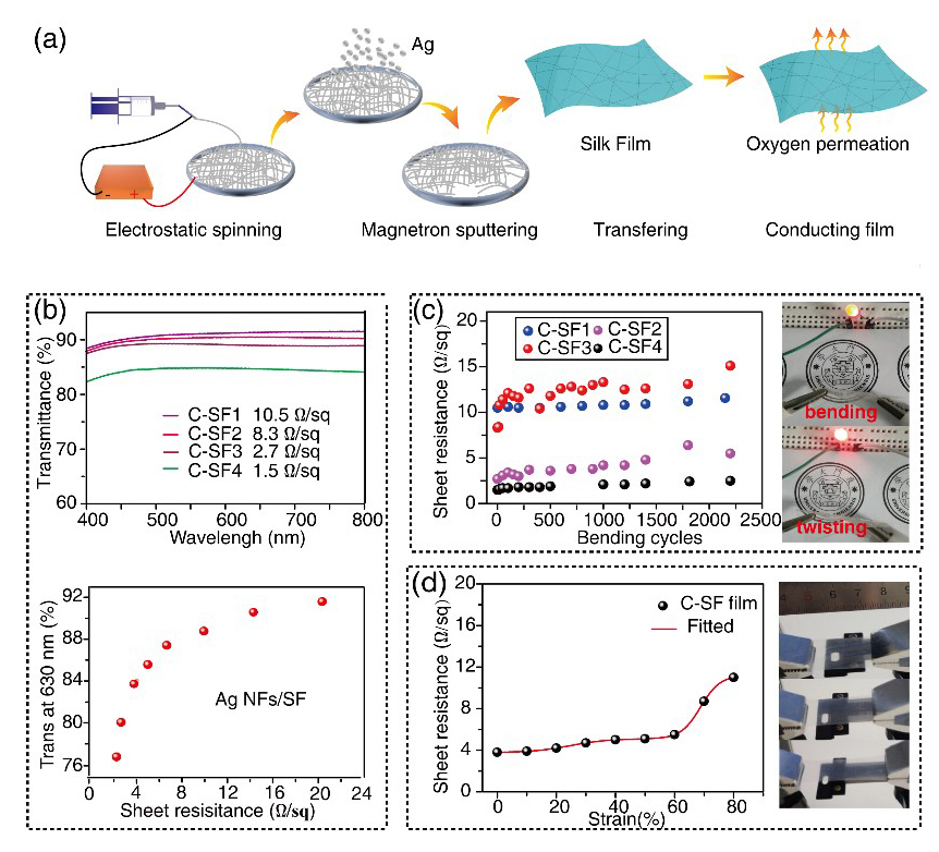 图1 柔性透明导电薄膜的制备和电学性能表征.a)导电丝素蛋白薄膜的制备示意图;b)导电薄膜的透光性和电学性能的关系;c)导电薄膜耐弯折性测试;d)导电薄膜的拉伸性测试